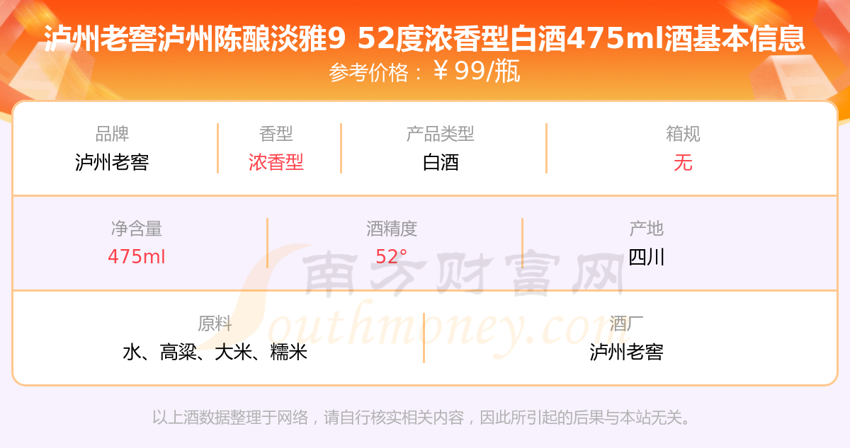 泸州老窖泸州陈酿淡雅952度浓香型白酒475ml基本信息