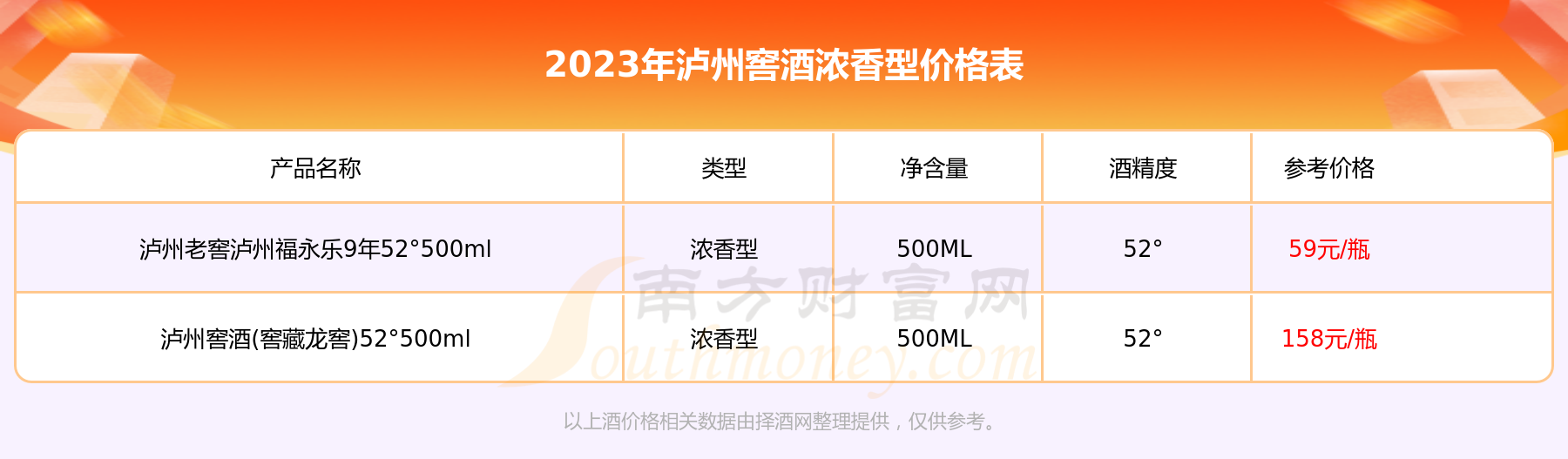 泸州窖酒浓香型酒最新价格2023:泸州窖酒(窖藏龙窖)52°500ml参考价158元/瓶、泸州老窖泸州福永乐9年52°500ml参考价59元/瓶。