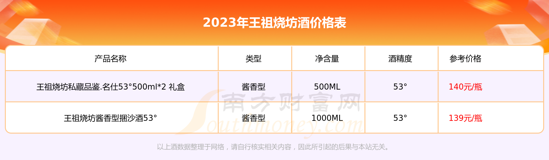 2023年,王祖烧坊私藏品鉴.名仕53°500ml*2礼盒、王祖烧坊酱香型捆沙酒53°等王祖烧坊酒价格如下: