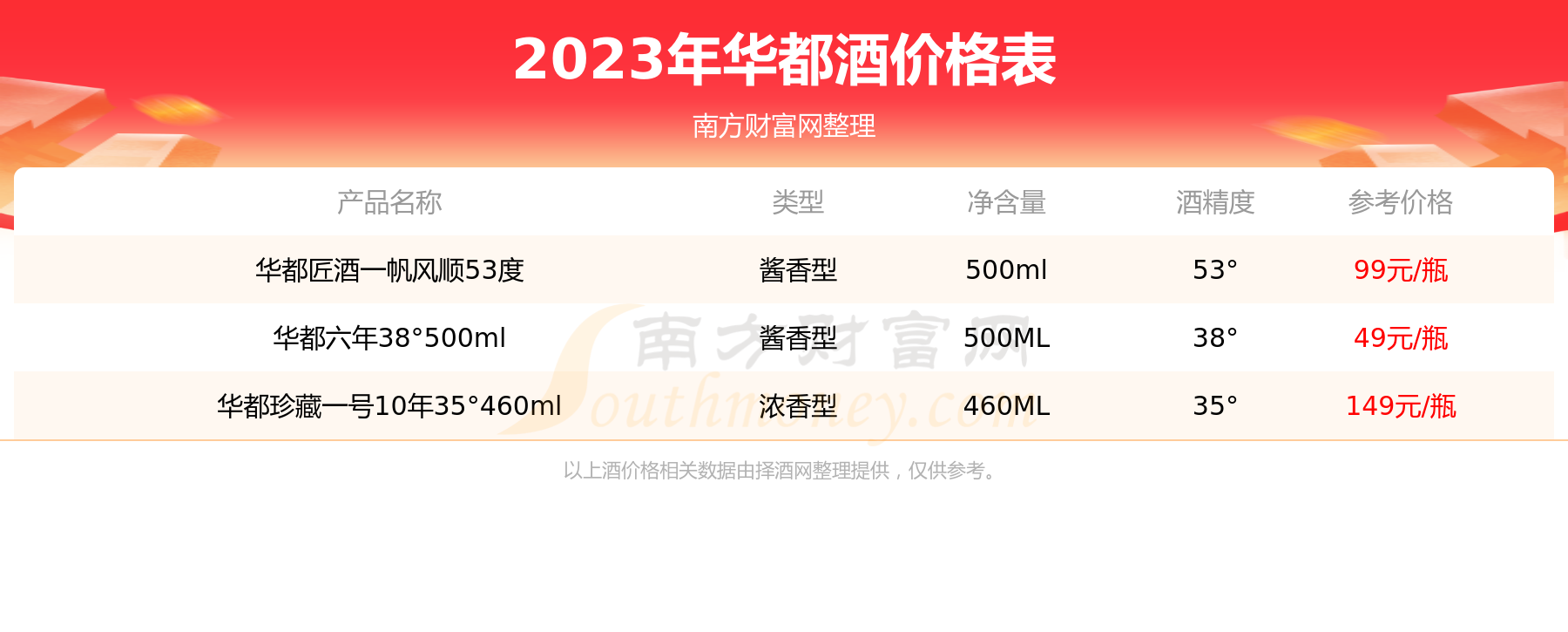 华都珍藏一号10年35°460ml参考价149元/瓶、华都匠酒一帆风顺53度参考价99元/瓶、华都六年38°500ml参考价49元/瓶。