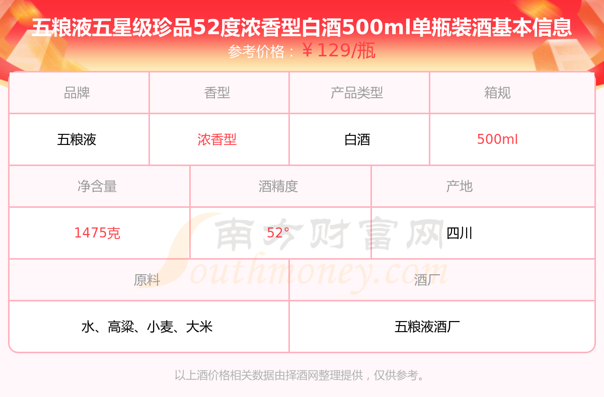 五粮液五星级珍品52度浓香型白酒500ml单瓶装基本信息