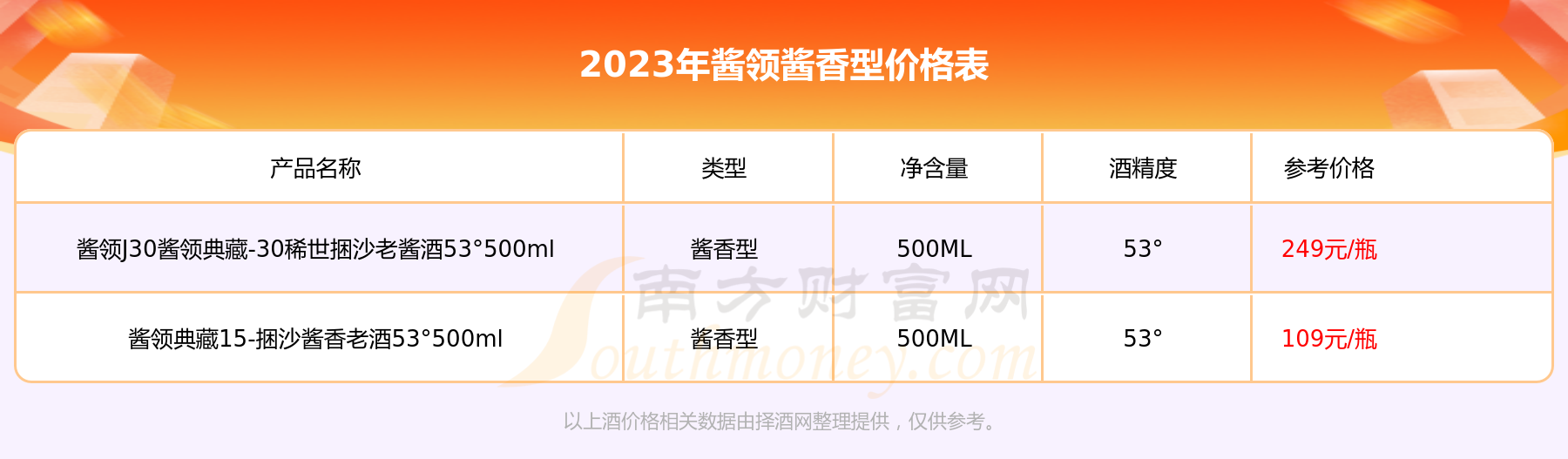 2023酱领酱香型酒最新价格:酱领J30酱领典藏-30稀世捆沙老酱酒53°500ml参考价249元/瓶、酱领典藏15-捆沙酱香老酒53°500ml参考价109元/瓶。
