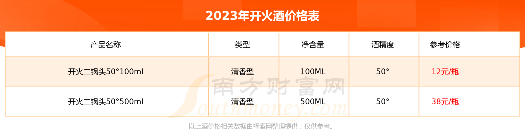 开火二锅头50°500ml参考价38元/瓶、开火二锅头50°100ml参考价12元/瓶。