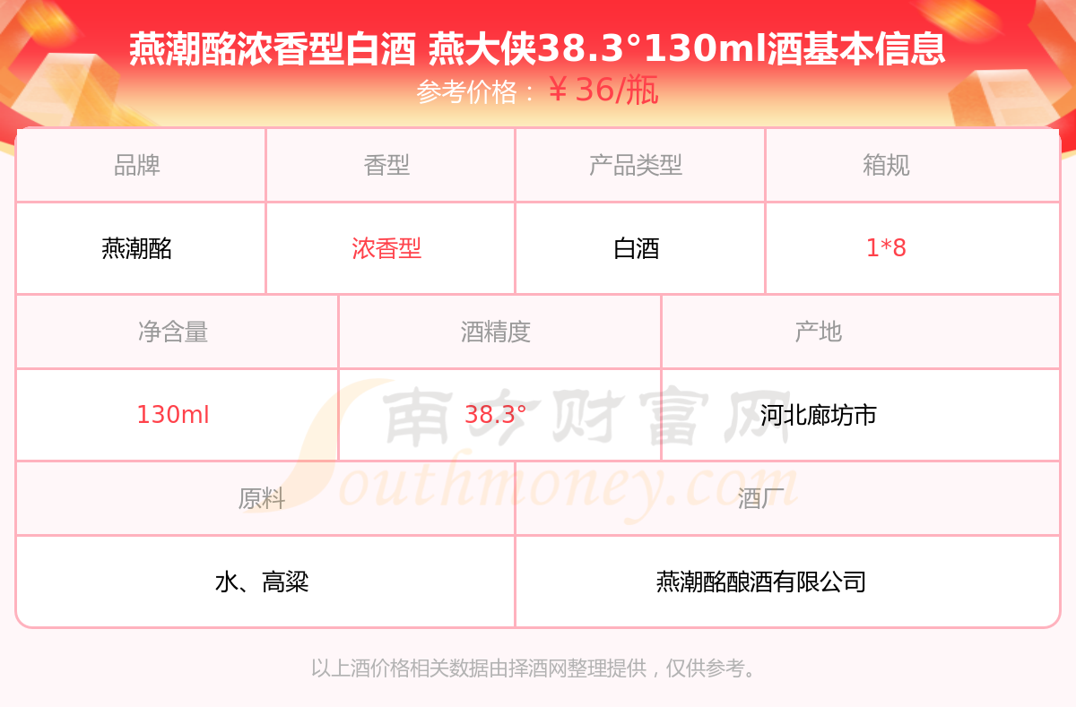 燕潮酩浓香型白酒燕大侠38.3°130ml基本信息