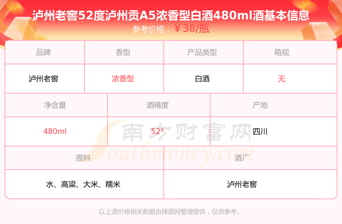 泸州老窖52度泸州贡A5浓香型白酒480ml基本信息