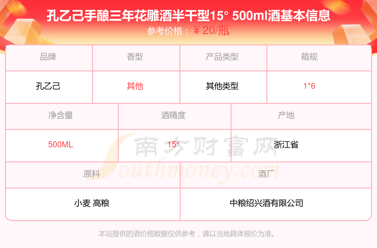 孔乙己手酿三年花雕酒半干型15°500ml基本信息