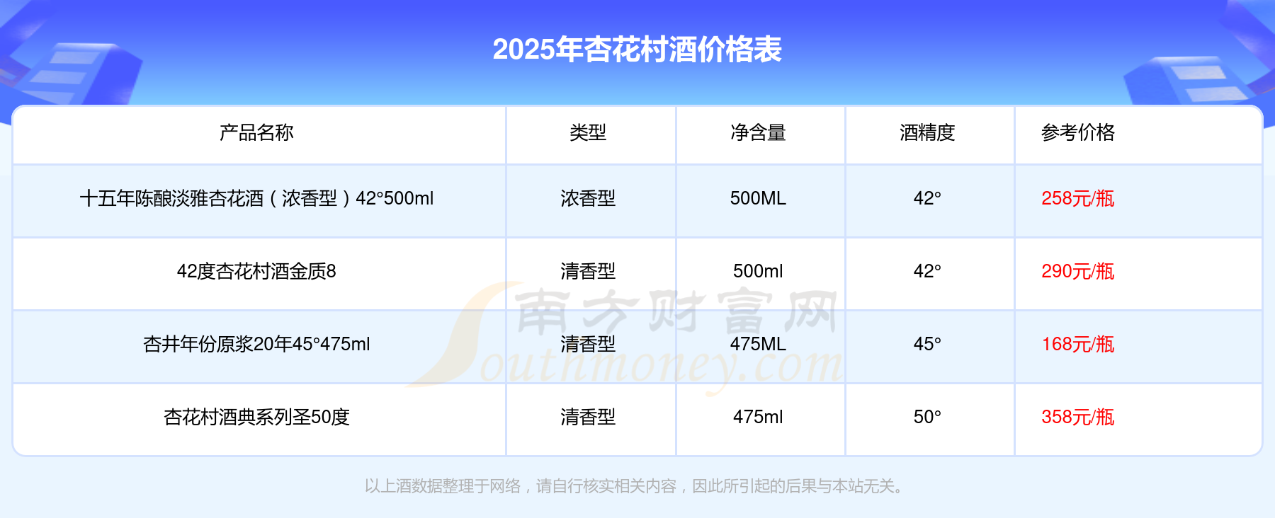 杏花村酒最新价格2025:杏花村酒典系列圣50度参考价358元/瓶、42度杏花村酒金质8参考价290元/瓶、十五年陈酿淡雅杏花酒(浓香型)42°500ml参考价258元/瓶、杏井年份原浆20年45°475ml参考价168元/瓶。